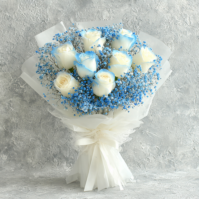 This bouquet whispers the secret between blue skies and clouds, with blue-edged white roses like waves at the horizon where sea meets sky, and blue baby's breath scattered like soft stardust. Wrapped in white paper and tied with a white ribbon, it holds the clarity of the sky and the tenderness of clouds in every petal. Set against a grey wall, each bloom seems to say: "With the sky as canvas and clouds as its dress, I gift you a dream of pure serenity" — a beauty that is both cool and romantic.